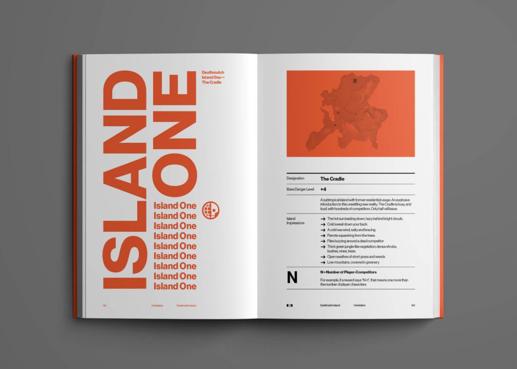 Jim: That, at least, is super true, Kieron Gillen. Deathmatch Island is DESIGNED. Denee is someone who really knows how to make things look polished and professional on the page, and I am not sure I own many books where the competency of things like page-design and making tables really fucking work good is quite as clear cut. It’s very Orange and White. It feels like something created with an incredibly specific vision in mind. The book, particularly as a physical object, captures the vibe so completely that it’s hard to imagine it being any other way. Triangle Agency does some similar stuff, but what’s here is more austere, sober, and disturbing, even while it is playful. To be sure, there are lot of incredibly pretty, high production value books right now, and this is not a book that is based on how good the illustrations are (they’re abstracted, and again, designed: a simple depiction of a grenade, a can of beans and so forth) all of which sells the corporatised, labelled, produced nature of the game as a fiction. This is a TTRPG where the GM (and by extension the forces that are causing the Deathmatch Island event to happen, whatever they might truly be) are literally called Production. It has the faceless, mysterious, moderately threatening banal alienness of big corporation stuff that occasionally appears in modern fiction. And to convey that in the visual design is masterful. It also evokes The Prisoner and 1960s weirdness, and it also spoofs modernity and the logic of corporate signage. We talked a bunch about how that vibe extends to the rest of the game, right?