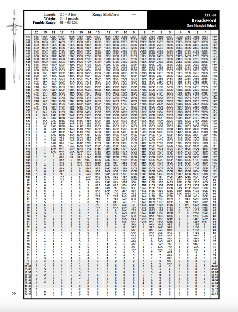 As in, this table is just for using the Broadsword. You want to whack someone with a Scimitar? That’ll be table ALT-22 you’ll be needing, honey.